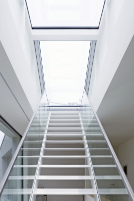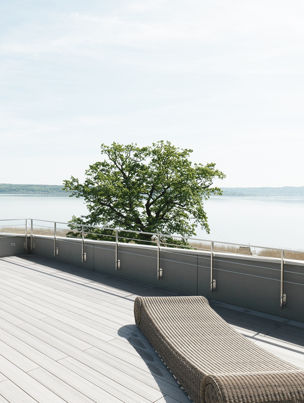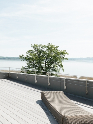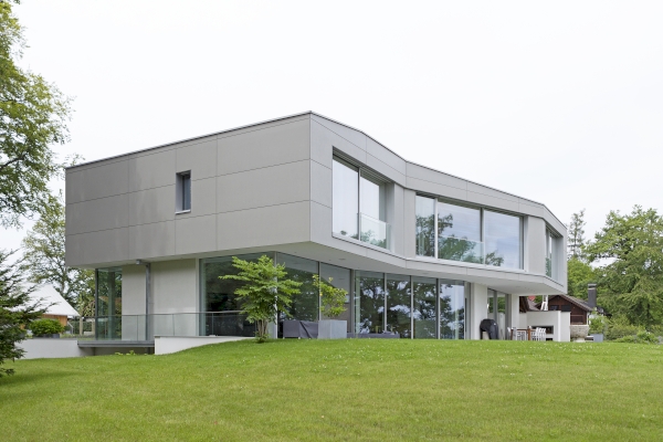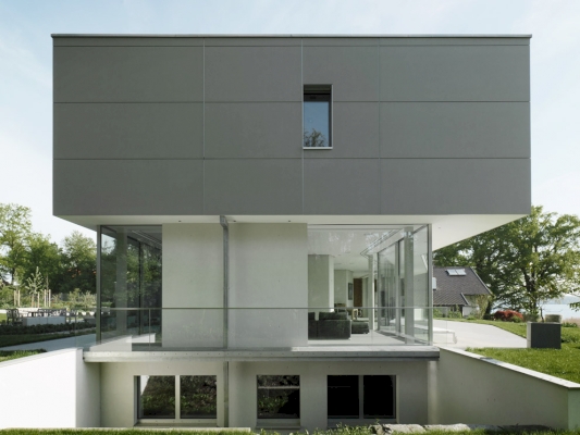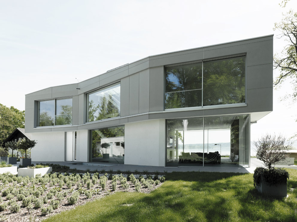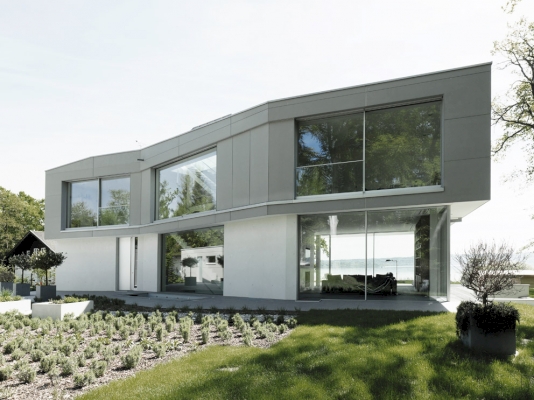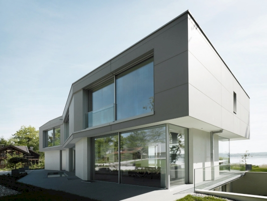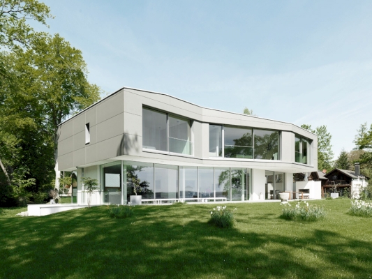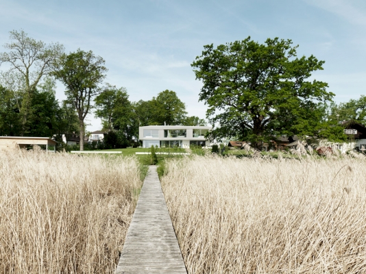 Neubau eines Einfamilienhauses am Seeufer, ein zweigeschossiger Gebäuderiegel mit nahezu vollständig verglastem Erdgeschoss.